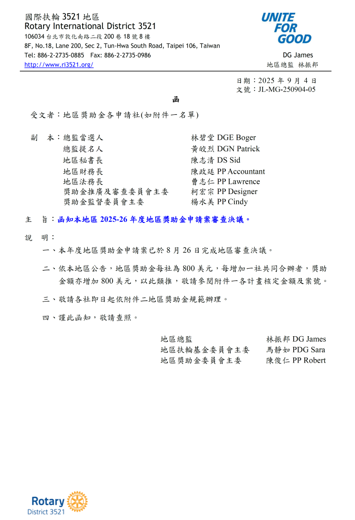函知本地區2025-26年度地區獎助金申請案審查決議