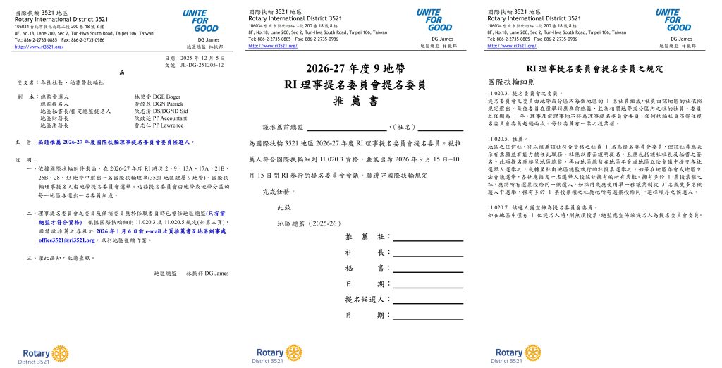 JL-DG-251205-12函請推薦2026-27年度國際扶輪理事提名委員會委員候選人