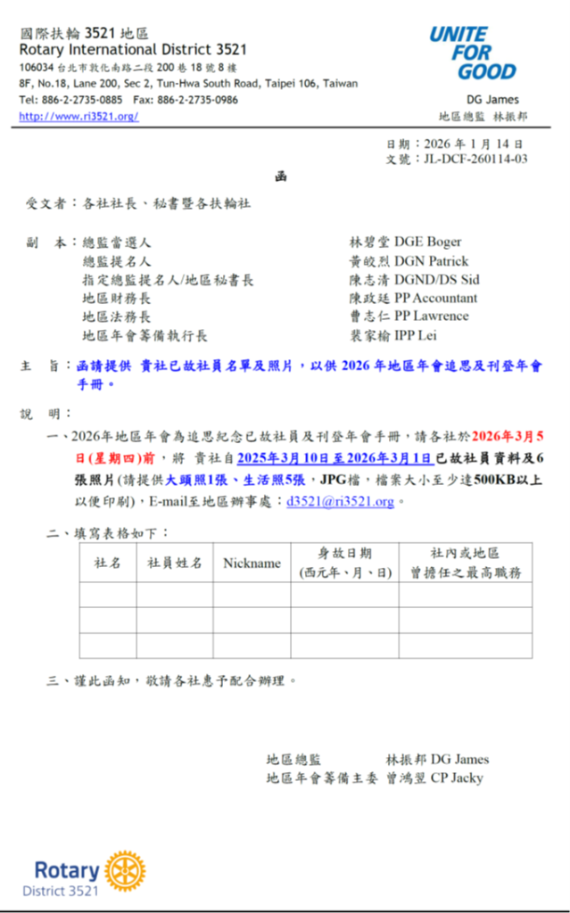函請提供 貴社已故社員名單及照片,以供2026年地區年會追思及刊登年會手冊