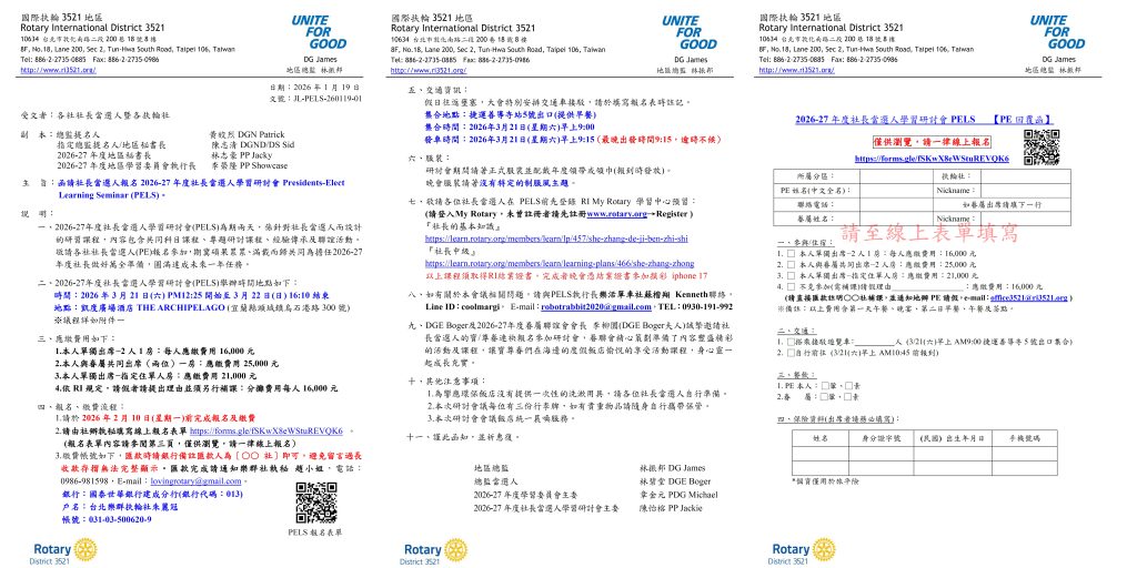 國際扶輪3521 - 地區公文 - 函請 報名2026-27年度社長當選人學習研討會PELS-PE