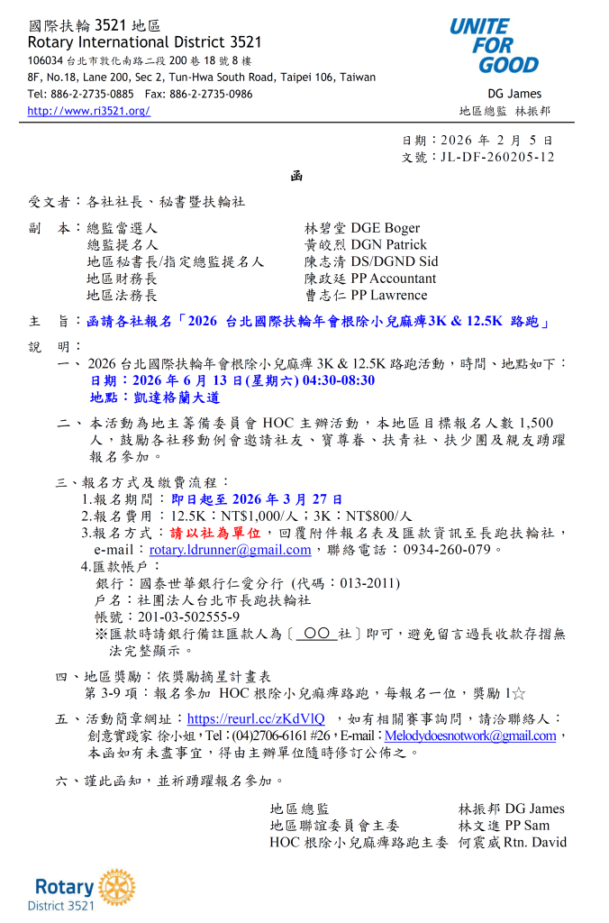 函請各社報名「2026 台北國際扶輪年會根除小兒麻痺3K & 12.5K 路跑」