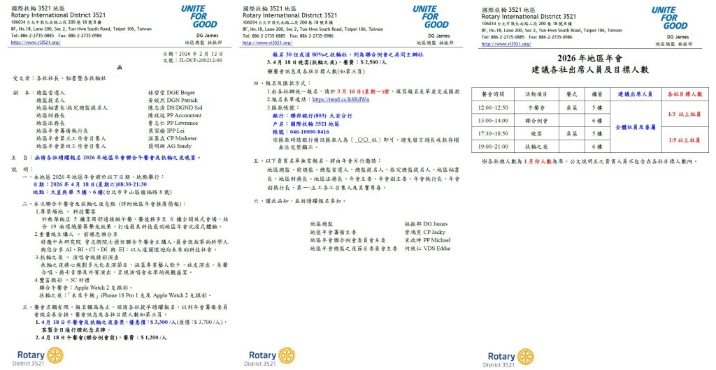 【公文】函請各社踴躍報名2026年地區年會聯合午餐會及扶輪之夜晚宴