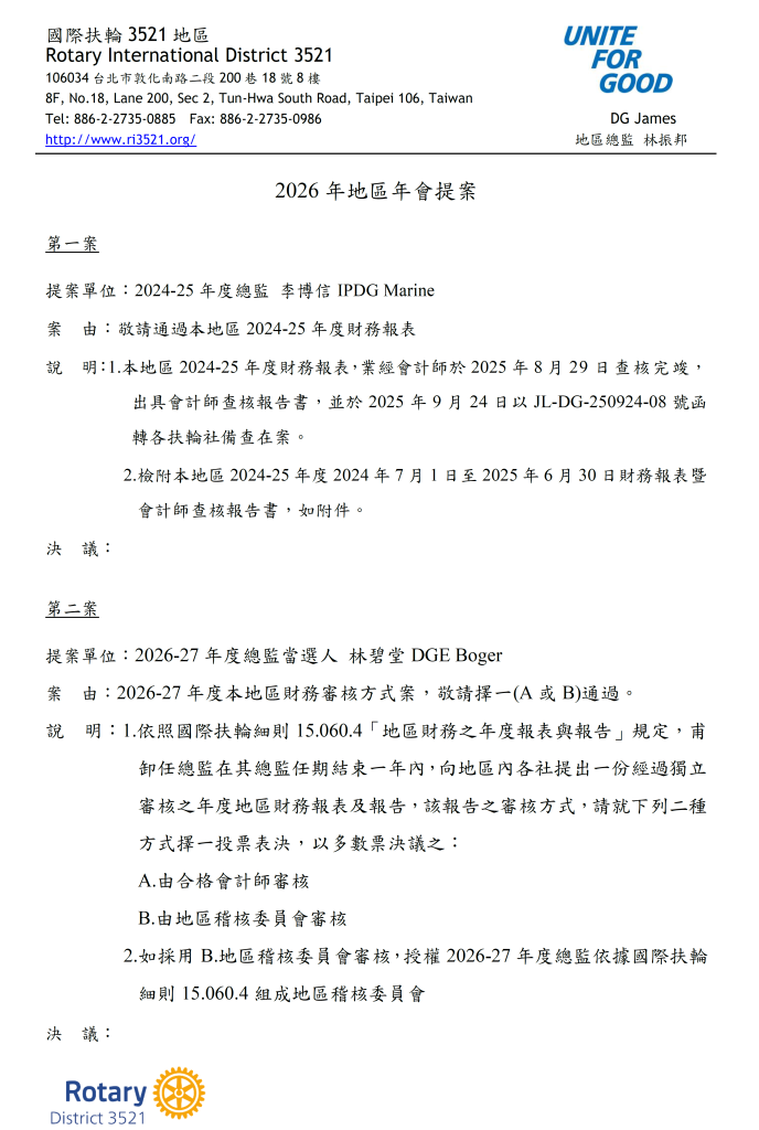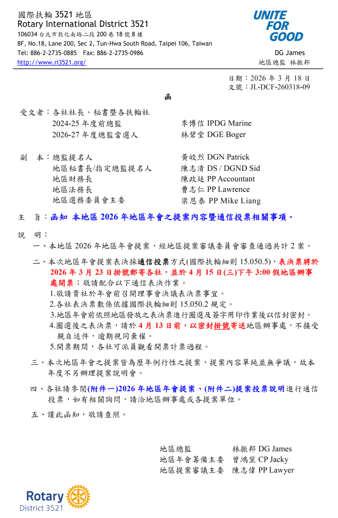 函知 本地區2026年地區年會之提案內容暨通信投票相關事項