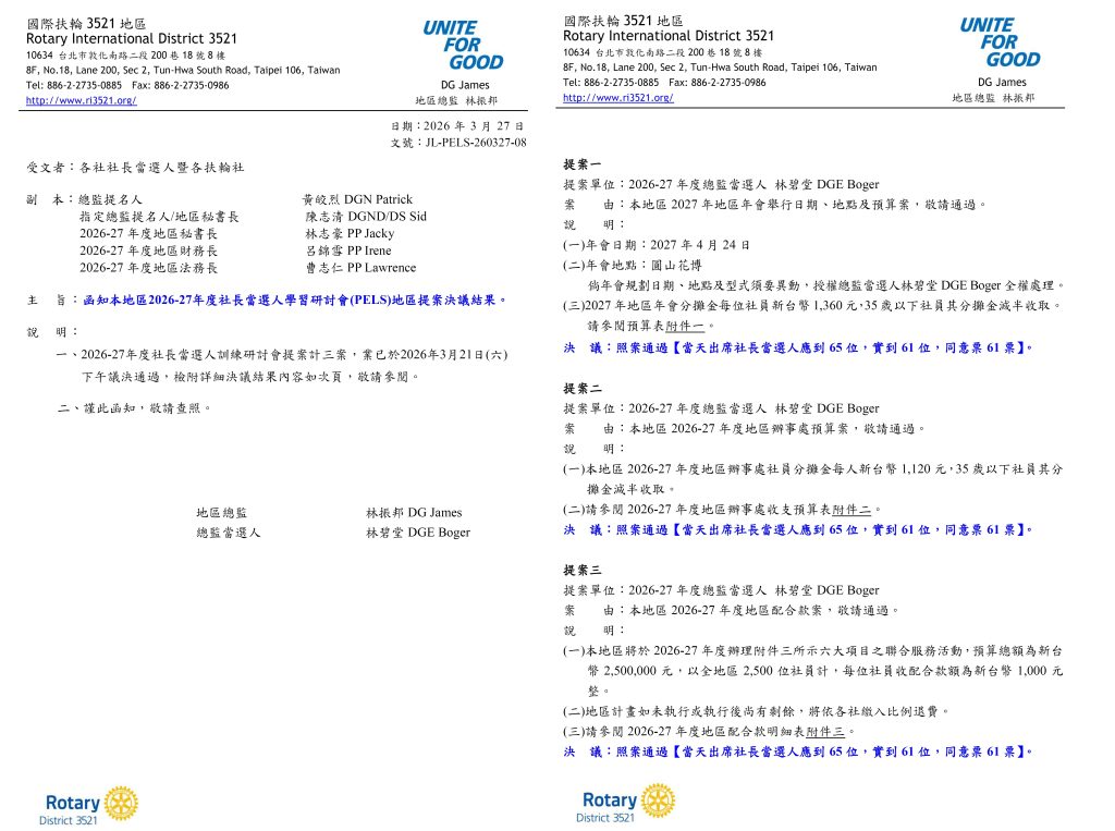 國際扶輪3521 - 地區公文 - 函知 本地區2026-27年度社長當選人學習研討會(PELS)地區提案決議結果