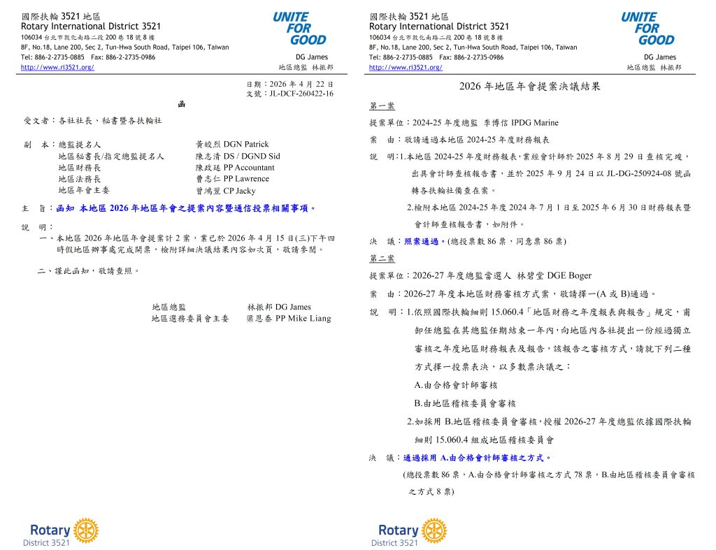 【公文】函知本地區2026年地區年會提案決議結果